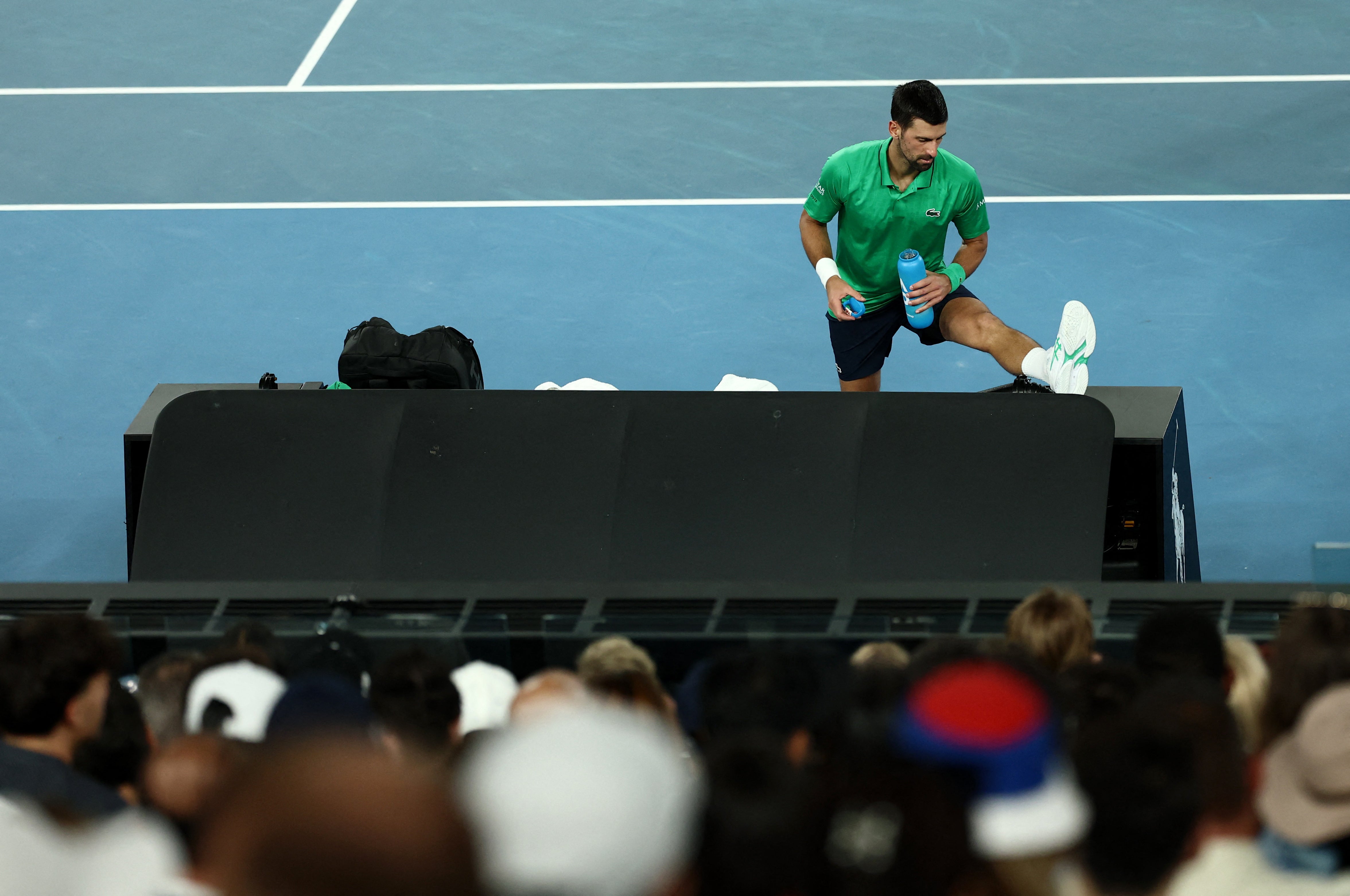 Djokovic hangs on in the next rally, as Sinner flashes wide – but he is starting to puff between the points and wince.
